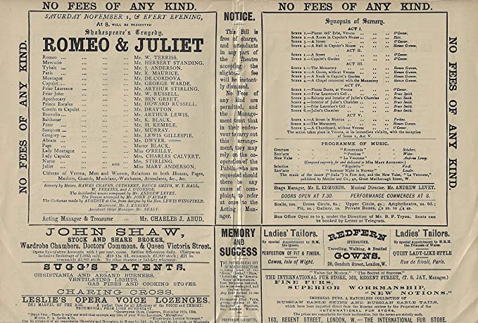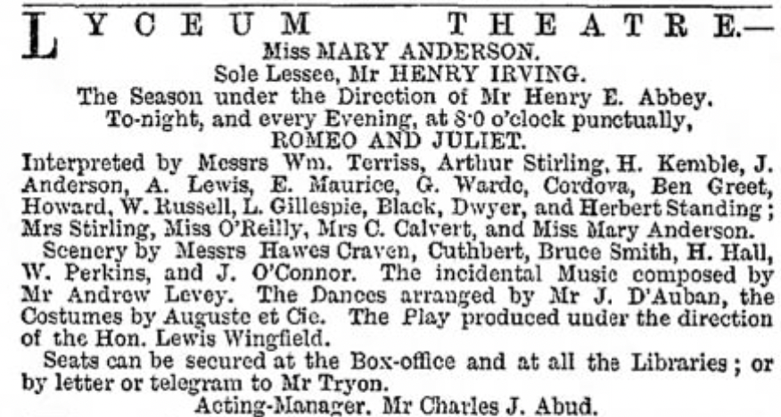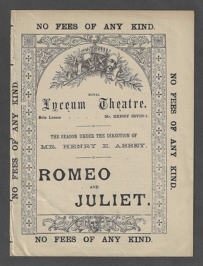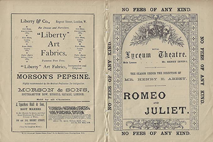 Romeo and Juliet playing at the Lyceum Theatre, owned by Henry Irving, 1885, Walter Russell playing Friar John.