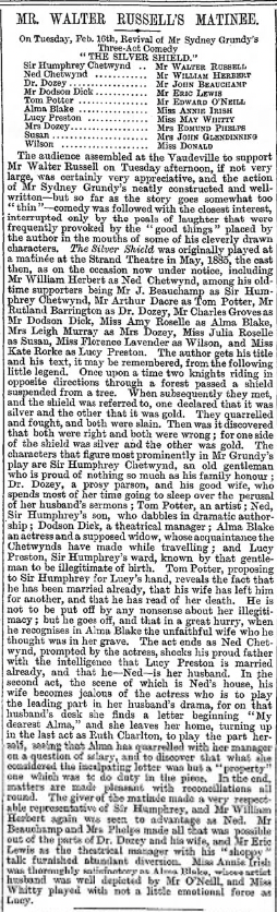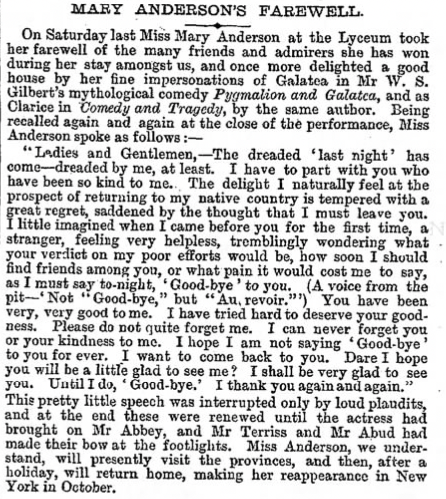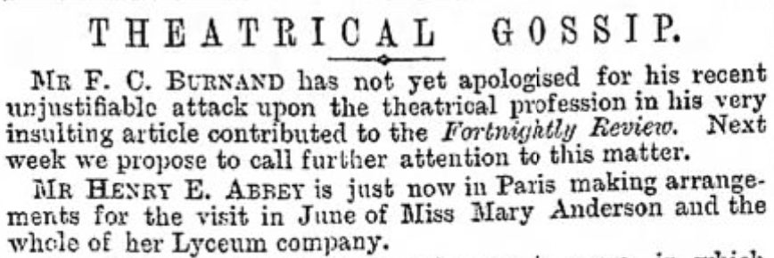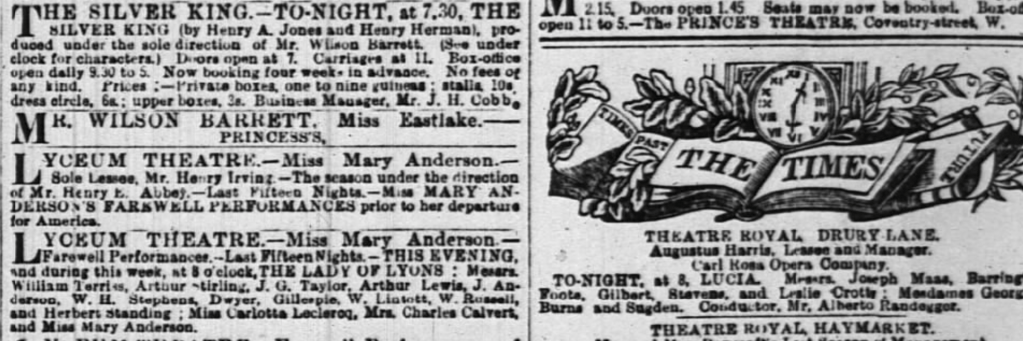 1885 was the great moment where Californian actress Mary Anderson was provided the Lyceum theatre for the year by Henry Irving, the greatest actor of the day. She was the cover of London Illustrated Times in 1887 for the Winters Tale. She was a prodigal Shakespearean actress. Walter Russell was part of Mary Anderson’s company. He was Friar John for the Romeo and Juliet that starred Terris as Romeo and Anderson as Juliet (https://www.amazon.com/William-Terriss-Anderson-Theatre-Program/dp/B085XNC6XY). He was Joseph for the play written for Mary Anderson by Gilbert from Gilbert and Sullivan called Comedy and Tragedy (https://gsarchive.net/gilbert/plays/com_trag/comedy_tragedy.pdf ). The V and A hold a silk programme from Comedy and Error which shows W Russell as Gilbert: https://collections.vam.ac.uk/item/O1368032/pygmalion-and-galatea-silk-programme-nassau-steam-press/. Comedy and Tragedy was played at the Drury Lane theatre organised by Augustus Harris for a charity event. Both Augustus Harris and William Terris are buried in Brompton cemetery. In the United Kingdom Mary Anderson was friends with Wilkie Collins, Lord Tennyson, Lord Lytton, Gladstone, Harris who was the first to proposition that she came to the UK, and Irving. She went to France and interviewed Victor Hugo.